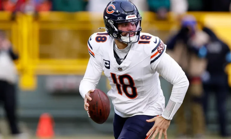 Caleb Williams #18 of the Chicago Bears takes off running looking for a receiver late in the game against the Green Bay Packers at Lambeau Field on January 05, 2025 in Green Bay, Wisconsin.